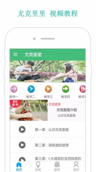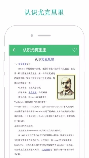 尤克里里教学是深圳冠恒天格软件有限公司旗下的一款音乐乐器教学软件,这款软件给用户们提供了非常丰富的乐理知识,用户们在这里可以进行全套的音乐学习。软件包含了多节课程。总练习歌曲超过200多首,并且还有音乐老师在线教导具体指法,是用户们提高自己尤克里里弹奏水平的好帮手。拥有丰富的学习资料,涵盖了多种教学资源,全面的帮助尤克里里爱好者进行学习,相应的只要用户登录该平台后,就可以免费查看所有资料,并详细的了解尤克里里;而且资料的形式多样,涵盖了曲谱、资料文档、图文、视频等形式学习内容,可以让相关用户全面的完成学习;并且移动学习更加方便,随时可以登录平台中进行学习,并按照分类查找需要的资料进行查看,无论是视频教学,还是尤克里里历史介绍,都可以发现适合的信息,并快速的完成尤克里里入门。