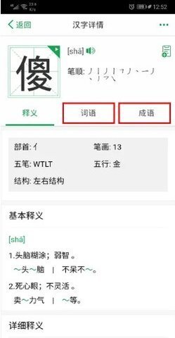 5.此时,我们就能看到这个字的详细信息(包括拼音、笔顺、含义等)。要是还想知晓该字的组词相关内容,可根据自身需求点击“词语”或“成语”进行查看。