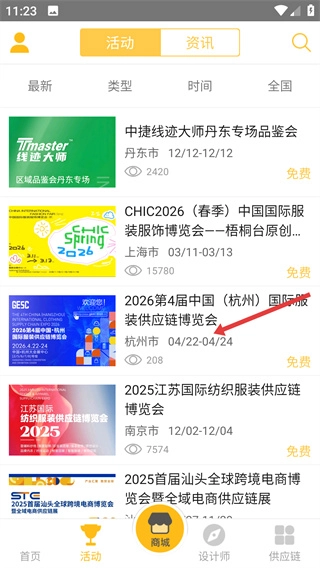 2、在活动页面找到【2026第4届中国-杭州国际服装供应链博览会】的相关条目并点击,即可进入该活动的详情页面。