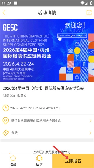 3、在活动详情页查看展会时间、地点等信息后,点击底部的【立即报名】按钮,即可进入报名操作页面。