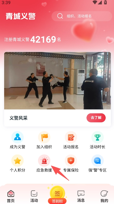 3、具备签到、消息等功能,契合义警日常参与活动与进行信息沟通的实际场景需求。