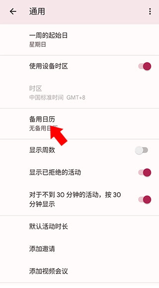 5、添加备用日历:进入通用设置界面,找到【备用日历】这一选项,点击该选项即可进入相关设置页面。