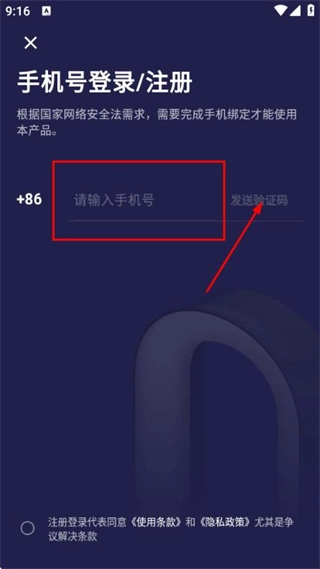 3、进入登录页面后,先填写手机号,再勾选相关协议,随后点击“获取验证码”按钮。