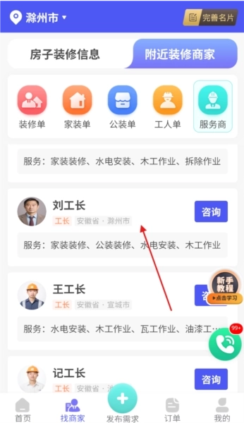 2、口碑导向展示:通过口碑排行的形式呈现周边的装修公司、工长等服务方,助力优质资源凸显,减少业主的选择成本。