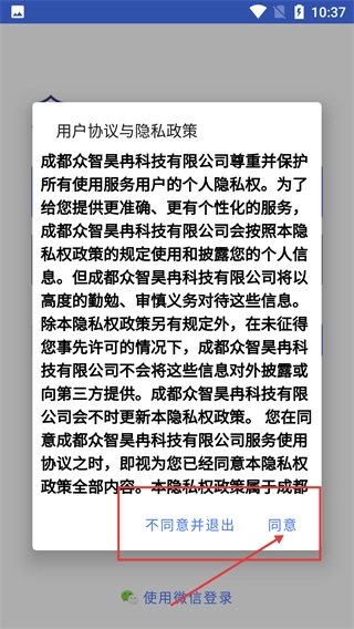 在【用户协议与隐私政策】的弹窗中,点击【同意】按钮既能进入后续界面,也可以选择【使用微信登录】。