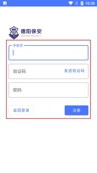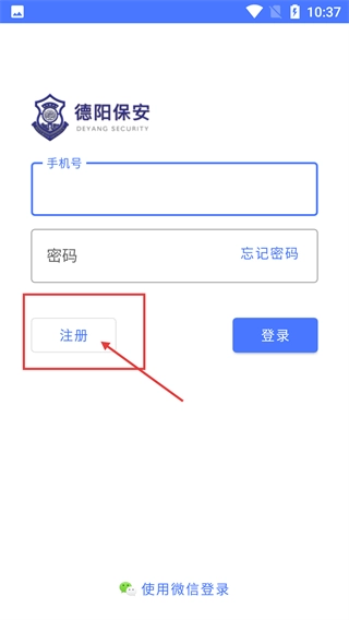 2、进入【德阳保安】登录页面,填写【手机号】和【密码】后点击【登录】即可;若还没有账号,点击【注册】按钮就能进入注册流程。