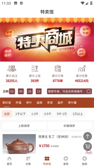 2、进入首页后,可选择艺人专区、名家力荐专区、特卖馆等板块进行浏览