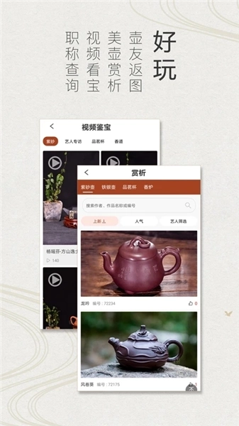 4、具备多种有趣且实用的功能,像壶友返图、美壶赏析、视频看宝、职称查询之类。