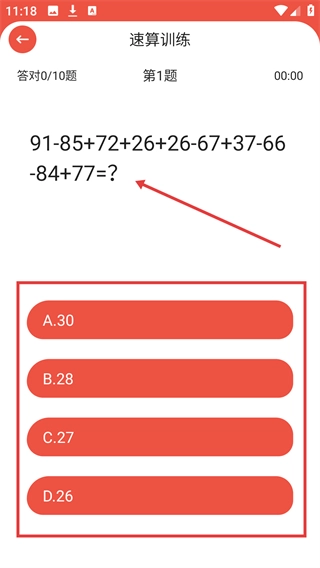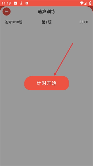 3、进入速算训练答题页面后,点击【计时开始】按钮即可启动限时答题流程,在此过程中需要对题目做出快速响应。