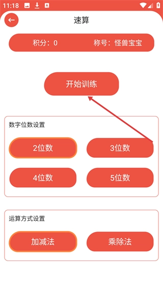 2、选择【2-位数】的数字位数以及【加减法】的运算方式,确认好这些参数后,点击【开始训练】按钮,即可进入答题环节。