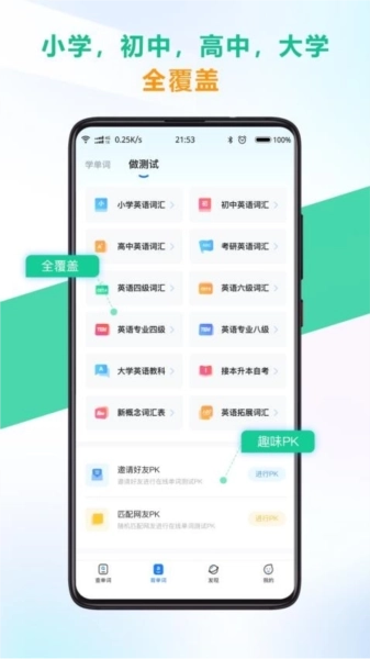 【学单词】丰富词库,覆盖小学至大学的不同学习阶段,用户能够不受时间地点限制进行单词背诵。