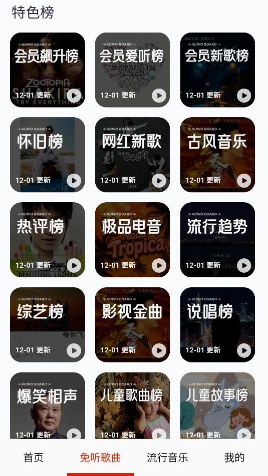 在免听歌曲页面,你可以挑选任意一种类型进入播放界面,并且这里的所有歌曲都支持免费播放。