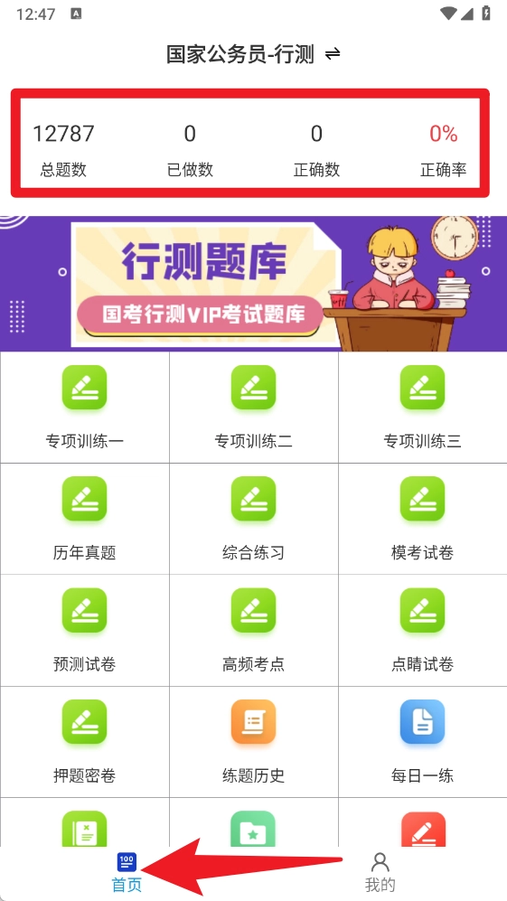 2、首页能够查看题库总量、正确率等数据,还可以进入历年真题、模拟试卷、专项训练等功能板块。