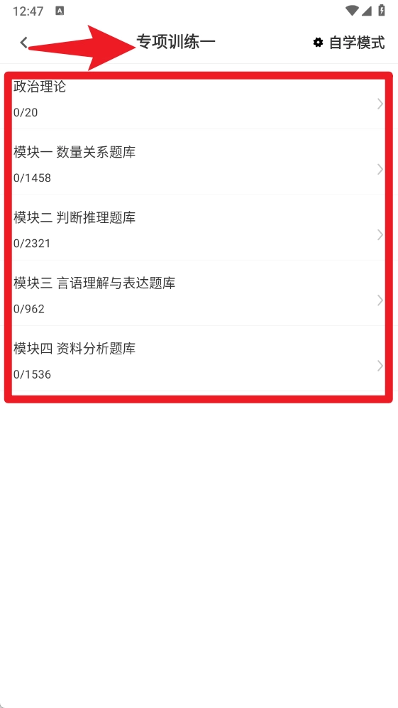 3、点击专项训练后,能够选择政治理论、数量关系、判断推理、言语理解、资料分析等不同模块开展练习。