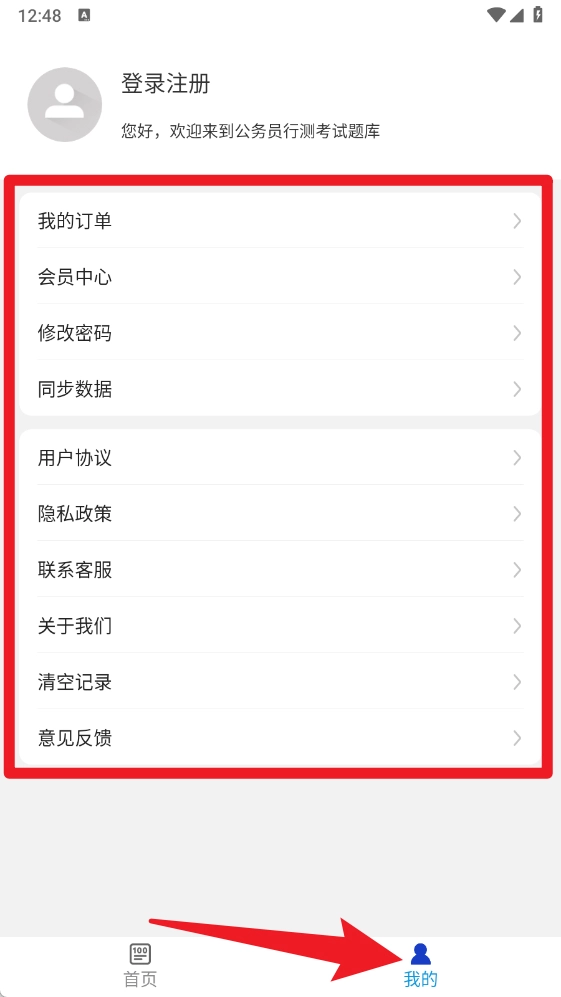 1、打开应用后,在考试选择界面选择国家公务员、省公务员考试类别或专项练习板块。
