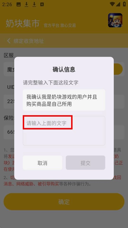4、绑定收货地址时,需在确认信息弹窗内完整输入【我确认我是奶块游戏用户且购买商品为本人使用】,方可继续后续操作。