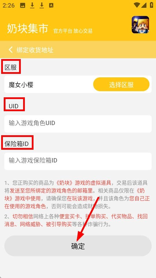 3、在【奶块集市】绑定收货地址的过程中,需要准确填写【区服】【UID】【保险箱ID】这些信息,之后点击确定按钮。