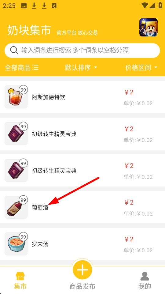 1、在【奶块集市】的集市页面,您可以点击像【葡萄酒】这类商品,进入其详情页开展后续操作。