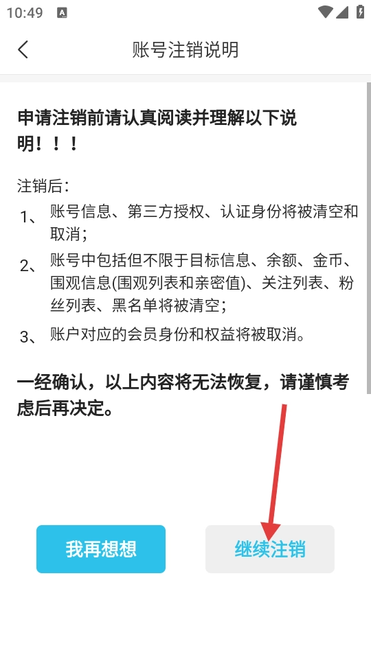 4、进入账号注销说明页面后,仔细阅读注销说明内容,随后点击【继续注销】按钮,即可推进账号注销流程的后续操作。