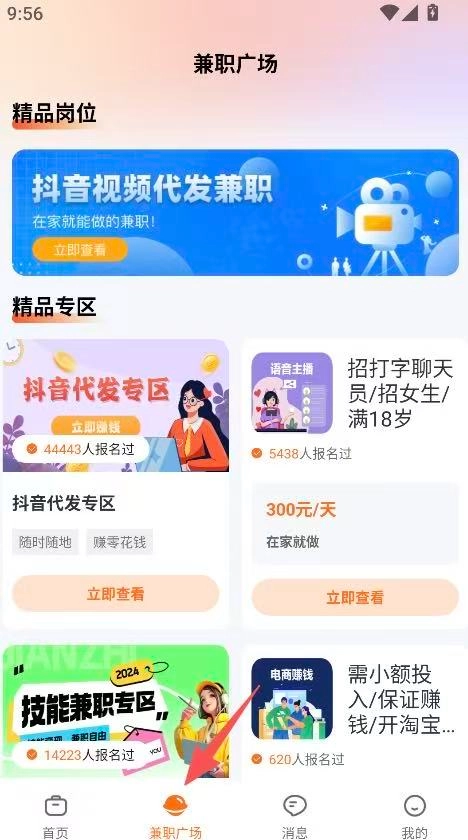 2、专区分类一目了然,精品专区、抖音代发专区等板块划分清晰,用户筛选兼职方便快捷,求职效率显著提升。