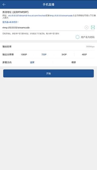 2、开展直播设置操作,填写推流地址(兼容RTMPSRT协议)。若该推流地址需要通过用户名与密码进行验证,需勾选右下方的复选框,并准确输入对应的用户名和密码。随后,对输出码率、输出分辨率以及屏幕方向进行配置,全部设置完毕后,点击下方的“开始”按钮即可。