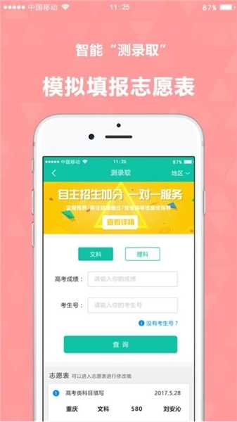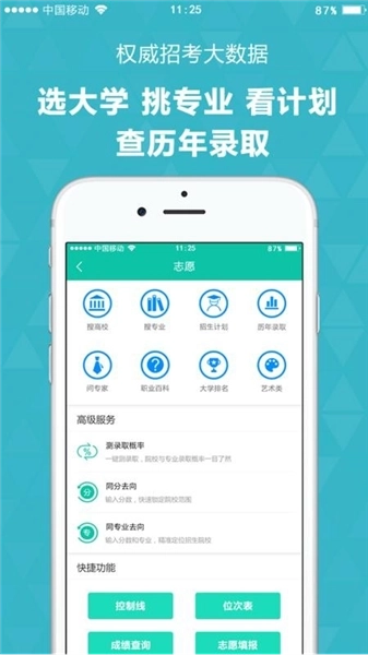 6.志愿辅助:借助大数据分析技术,关联高考成绩信息,预估大学及专业的录取可能性,助力考生减少落榜几率。
