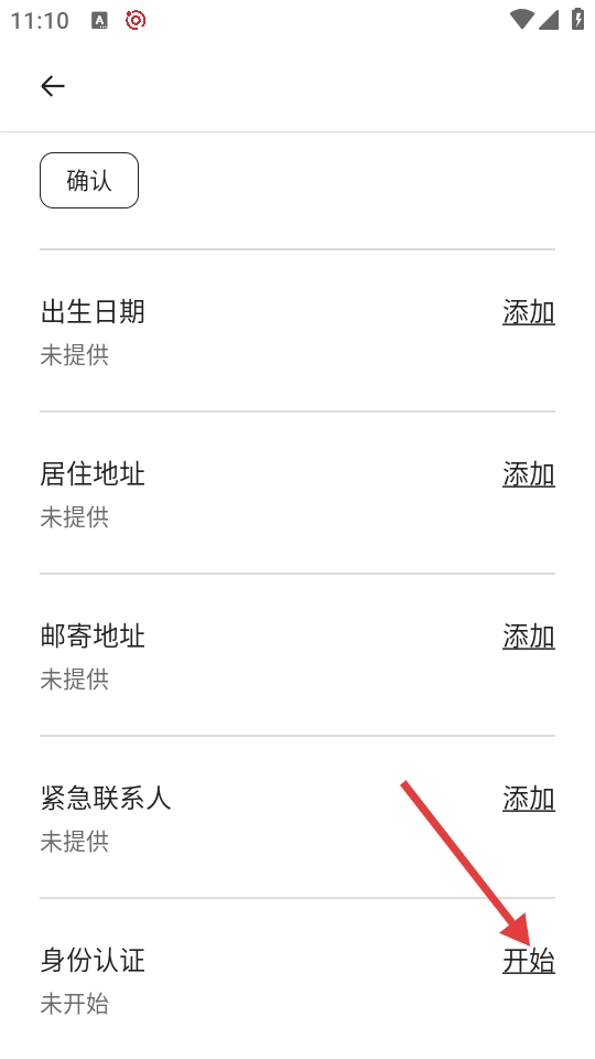 4、进入个人信息编辑页面后,找到【身份认证】选项,点击其后的【开始】按钮,即可启动身份认证流程。