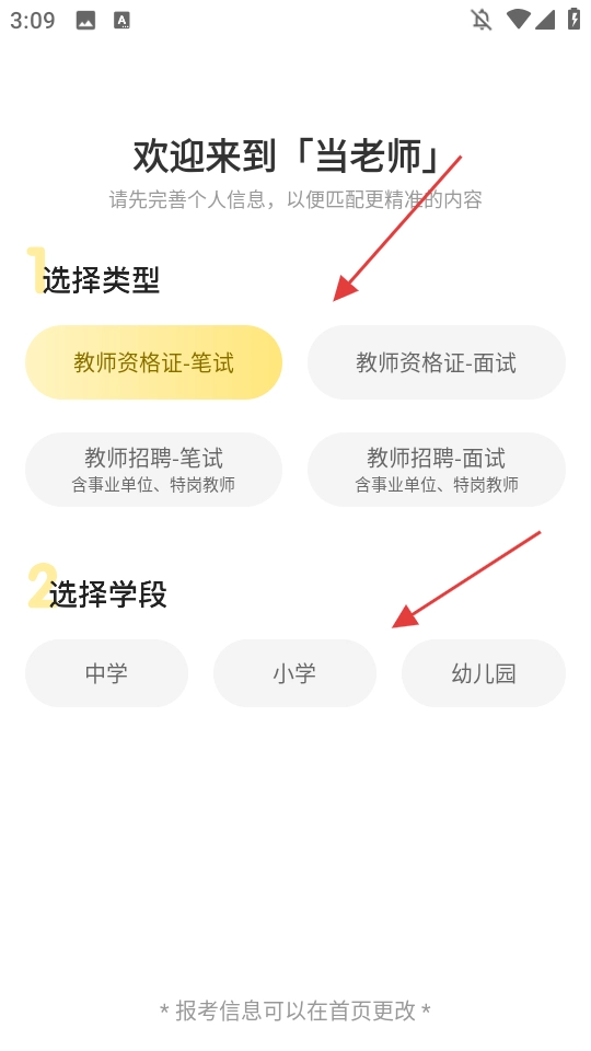 4、登录成功后,选择对应的类型与学段,完成信息完善的相关操作。