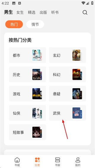 在分类页面里,挑选武侠类别,就能进入武侠小说的列表页面。