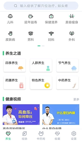 1、启动软件后,在养生首页能够搜索想要查询的养生知识或疾病相关内容,还能获取养生之道。