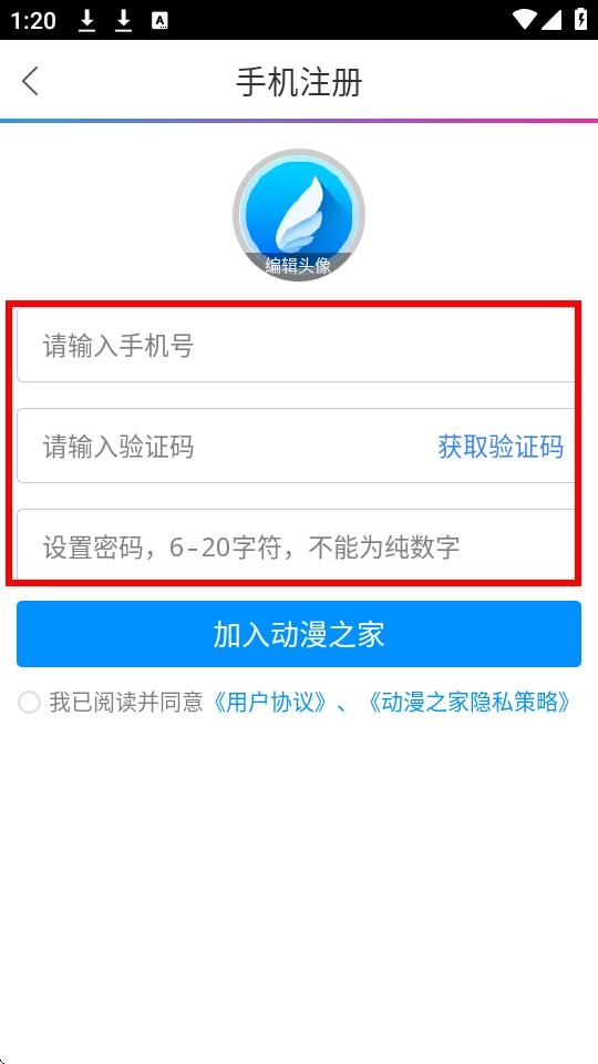 4、进入【手机注册】页面后,按顺序填写手机号、获取并输入验证码、设置密码,勾选相关协议,最后点击【加入动漫之家】按钮,即可完成注册流程。