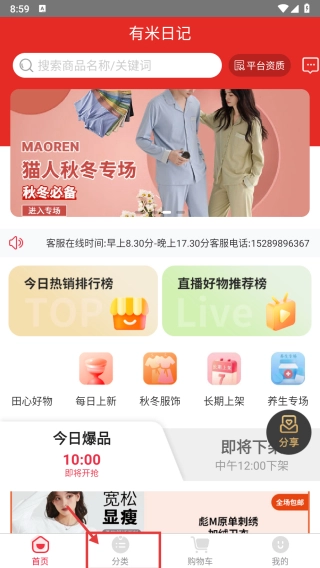 1、打开电商类首页,点击底部的分类选项,进入分类页面。