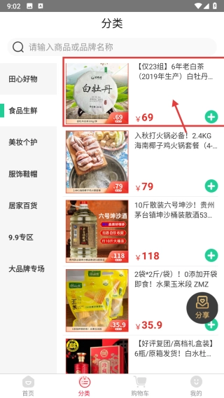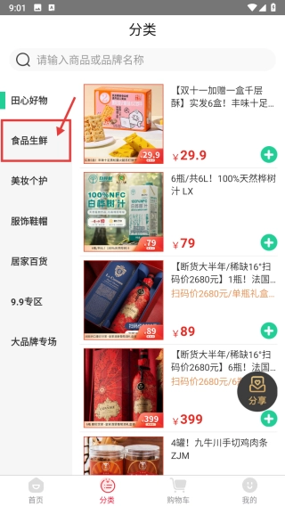 2、进入分类页面后,点击食品生鲜板块,即可进入食品生鲜商品列表页面。