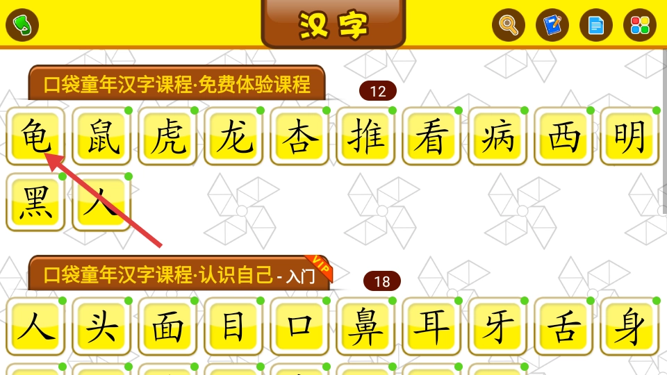3、进入自由模式界面后,挑选你想要学习的汉字,比如【龟】字,点击它就能进入该汉字的学习页面。