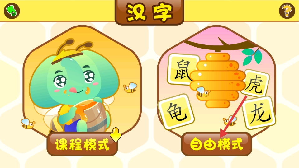 2、在汉字学习页面,点击【自由模式】按钮,即可进入自由学习汉字的界面。