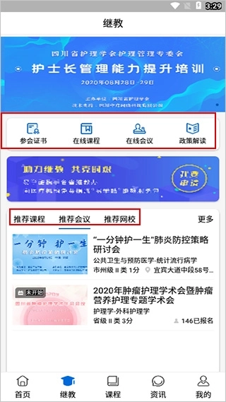 2、首页涵盖在线课程、课程直播、问答社区、医学会议以及学分查询等功能。