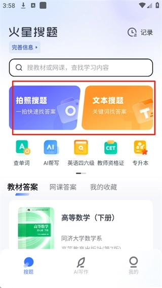 2、进入主页面后,能看到“拍照搜题”和“教材网课”两个功能选项,我们可以任选其中一项点击进入。