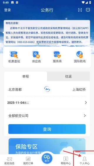 1、找到并打开公务出行类应用,点击底部导航栏中的“个人中心”选项,即可进入个人中心页面。