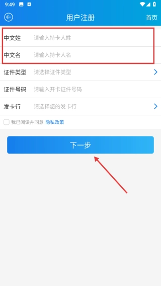 4、在用户注册信息填写页面,依次填写中文姓氏、中文名字,选择对应的证件类型,勾选同意相关协议后,点击“下一步”按钮,即可完成账号注册流程。