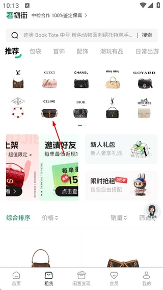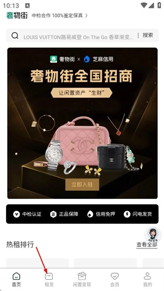 1、打开奢物街租包应用,在首页找到并点击“租赁”选项,即可进入租赁页面。