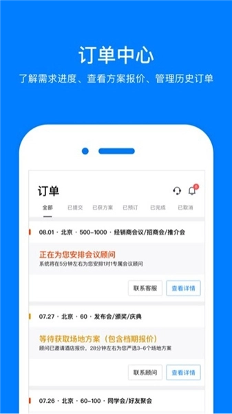 2、订单中心划分了多种订单状态栏目,包含已提交、已获方案、已预订等不同状态;