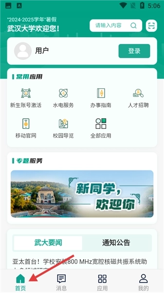1、点击进入的首页界面,洋溢着对2024 - 2025学年暑假的热情欢迎氛围,这里集成了登录入口与常用应用,同时还展示着武大要闻等各类资讯。