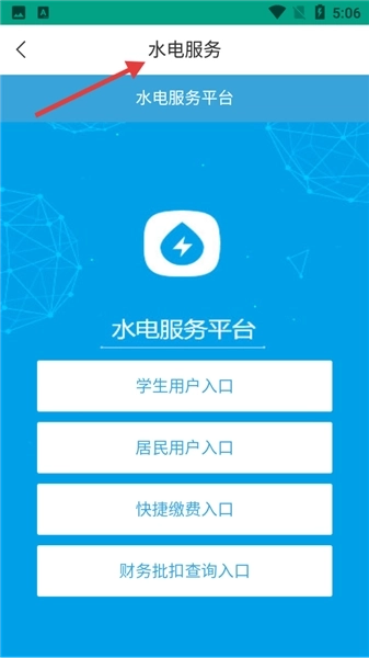 2、水电服务专属页面归属于水电服务平台,针对学生用户和居民用户各自设置了入口,此外还设有缴费、财务查询等便捷功能入口。