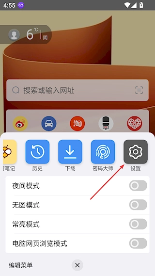 2、在弹出菜单的第一行区域向左滑动屏幕,找到【设置】选项后点击打开;