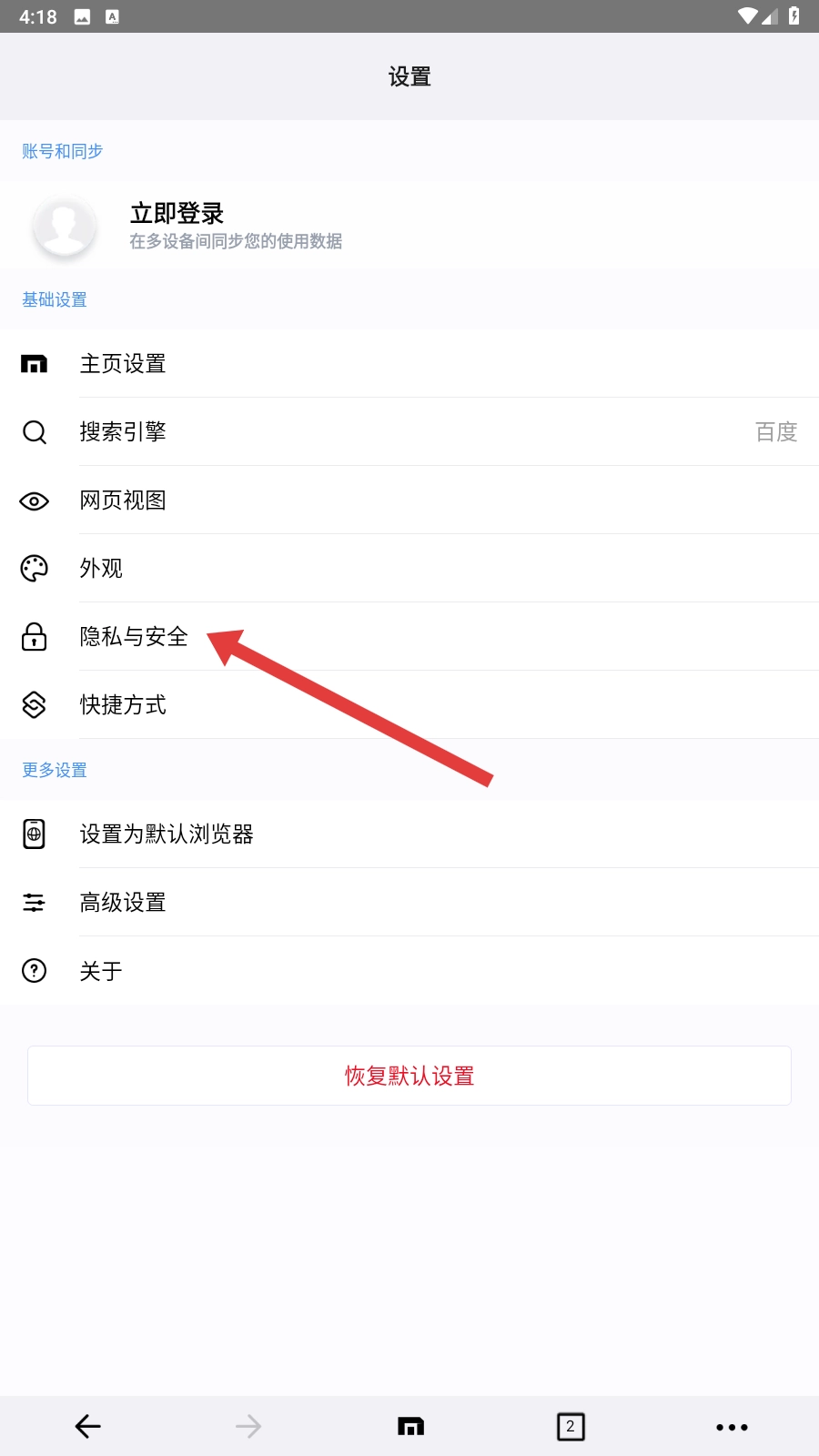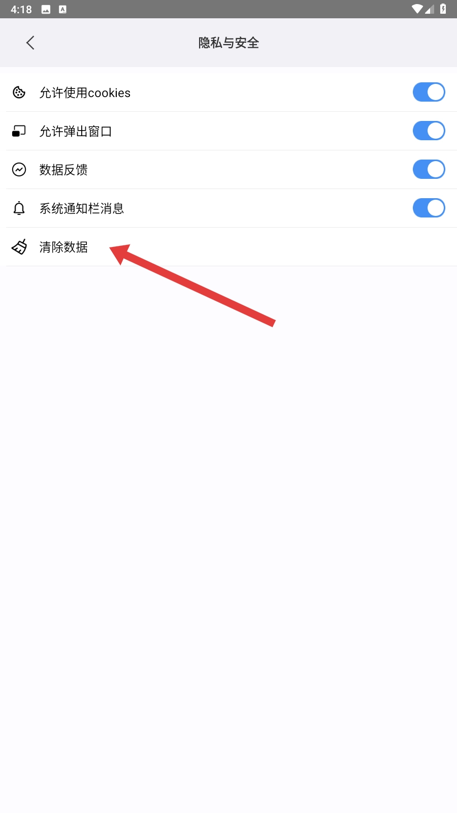 2、点击【隐私与安全】,即可进入数据清除的具体选项界面。