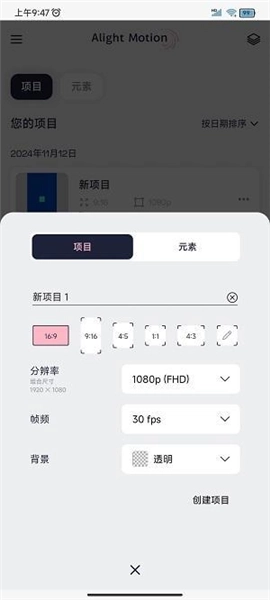 1、在本站完成安装后,启动软件并打开,先点击首页中间的加号按钮,通过这一操作可进行项目创建,接着依据自身需求对项目名称、比例、分辨率、帧频以及背景进行设置;