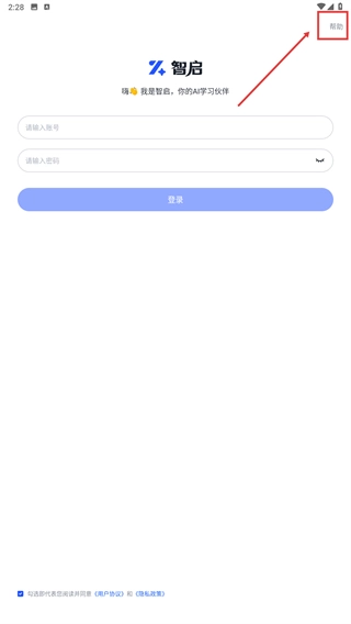 1、在智启启动的用户协议,点击【同意】按钮,完成协议确认以进入应用登录界面。