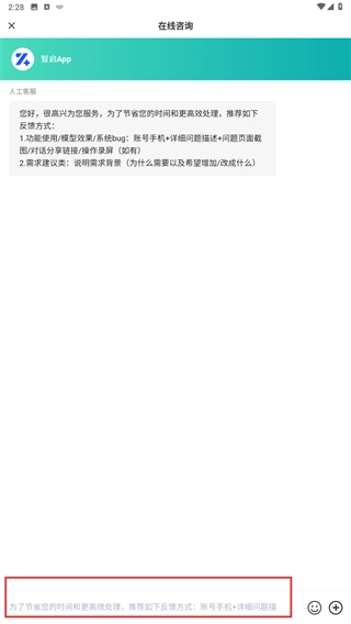 4、在在线咨询页,按照客服提示的反馈方式,在输入框填写问题信息(如功能bug、需求建议)并提交咨询。