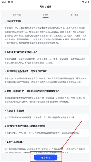 3、在帮助与反馈页,查看智能体相关的问题解答后,点击【在线咨询】按钮,进入人工客服对话界面。
