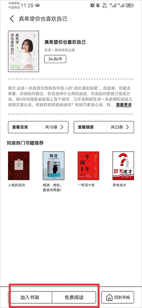 2、进入书籍介绍界面中,你可以直接点击免费阅读,也可以先将它加入书架中